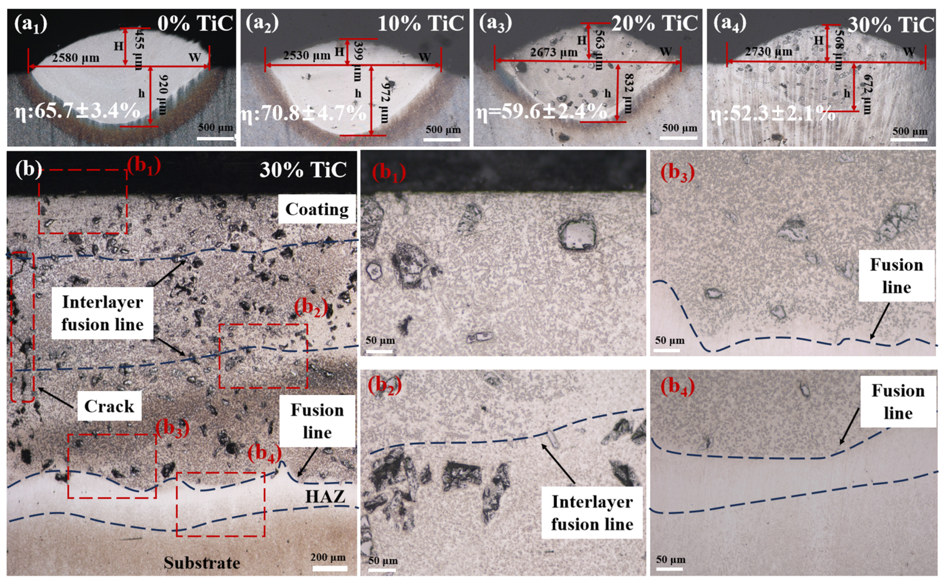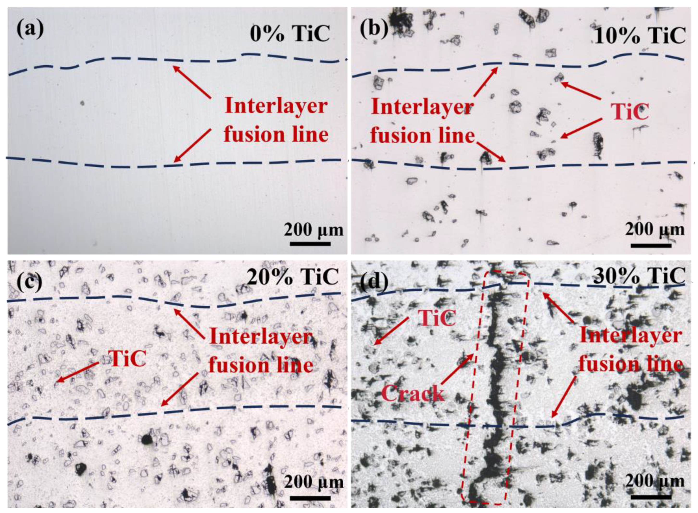 - The microhardness increases with increasing TiC content. The coating with 30% TiC achieves the highest average hardness of 1095.9 HV0.5, approximately five times that of the as-annealed H13 steel substrate (205.2 HV0.5). However, excessive TiC addition leads to particle agglomeration, interfacial stress concentration, and microcrack formation, negatively influencing the performance of the coatings.