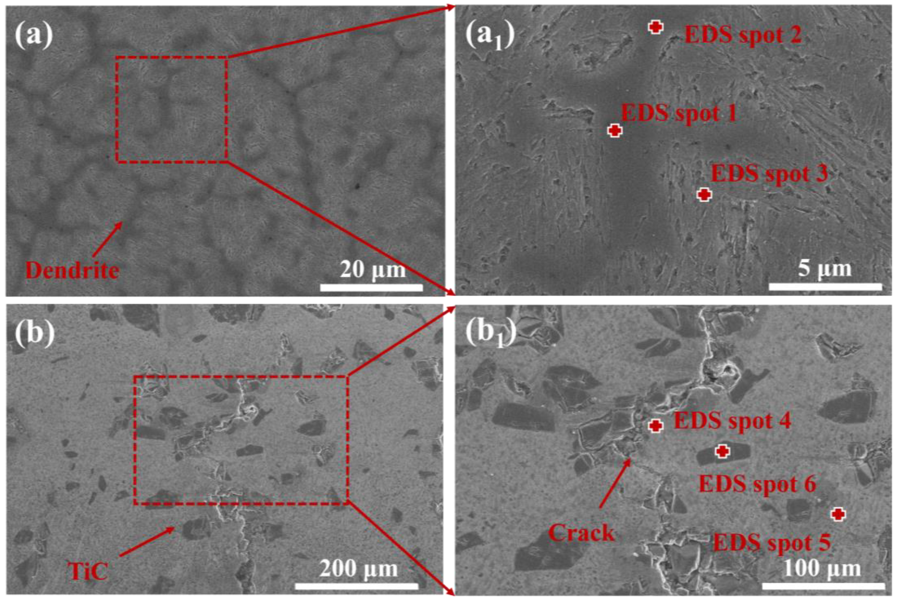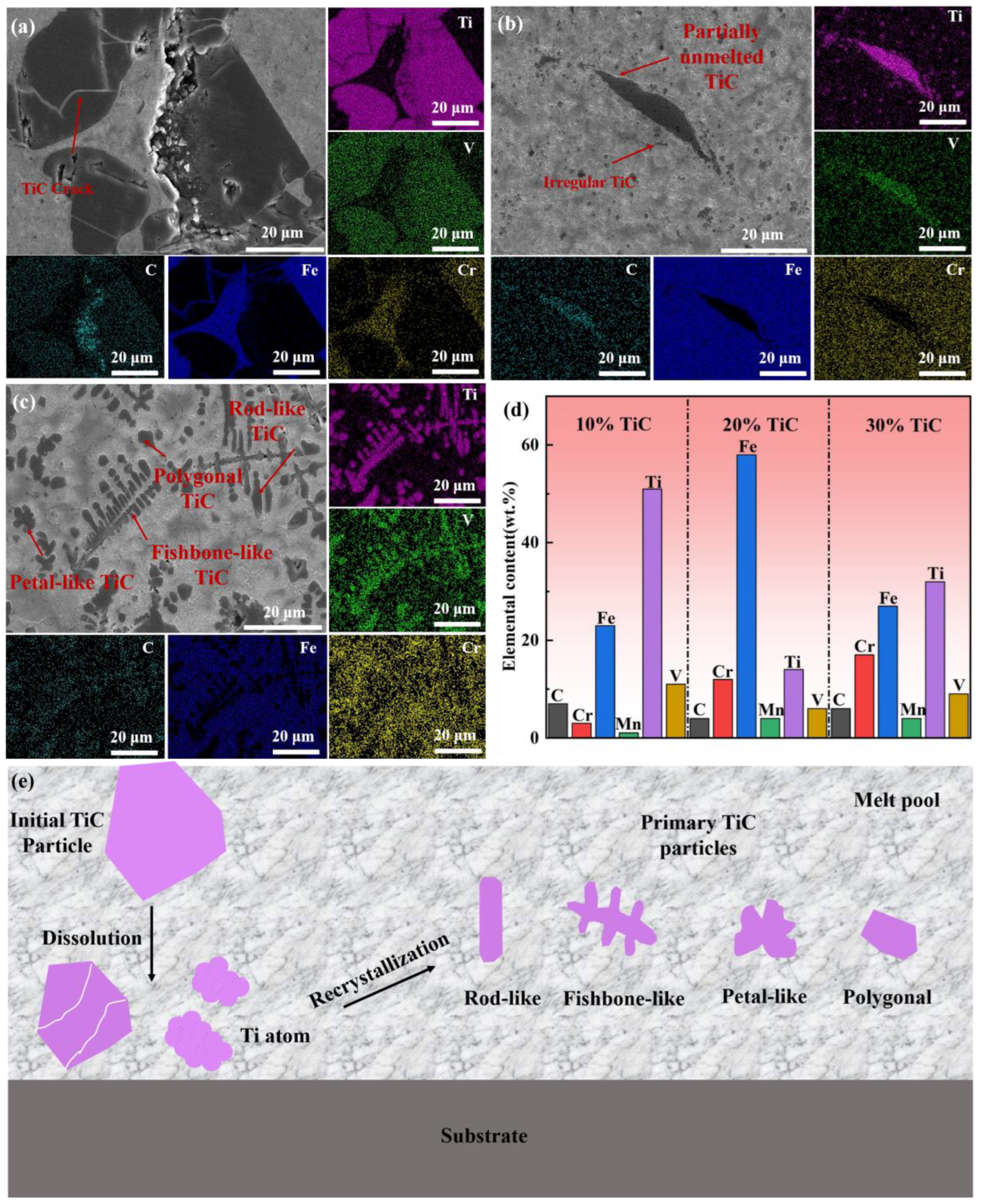 - TiC particles act as heterogeneous nucleation points and effectively promote grain refinement. Under the thermal gradient and directional solidification conditions of laser cladding, combined with the local Ti and C concentration fields, TiC undergoes morphological evolution, resulting in petal-like, rod-like, fishbone-like, and polygonal features.