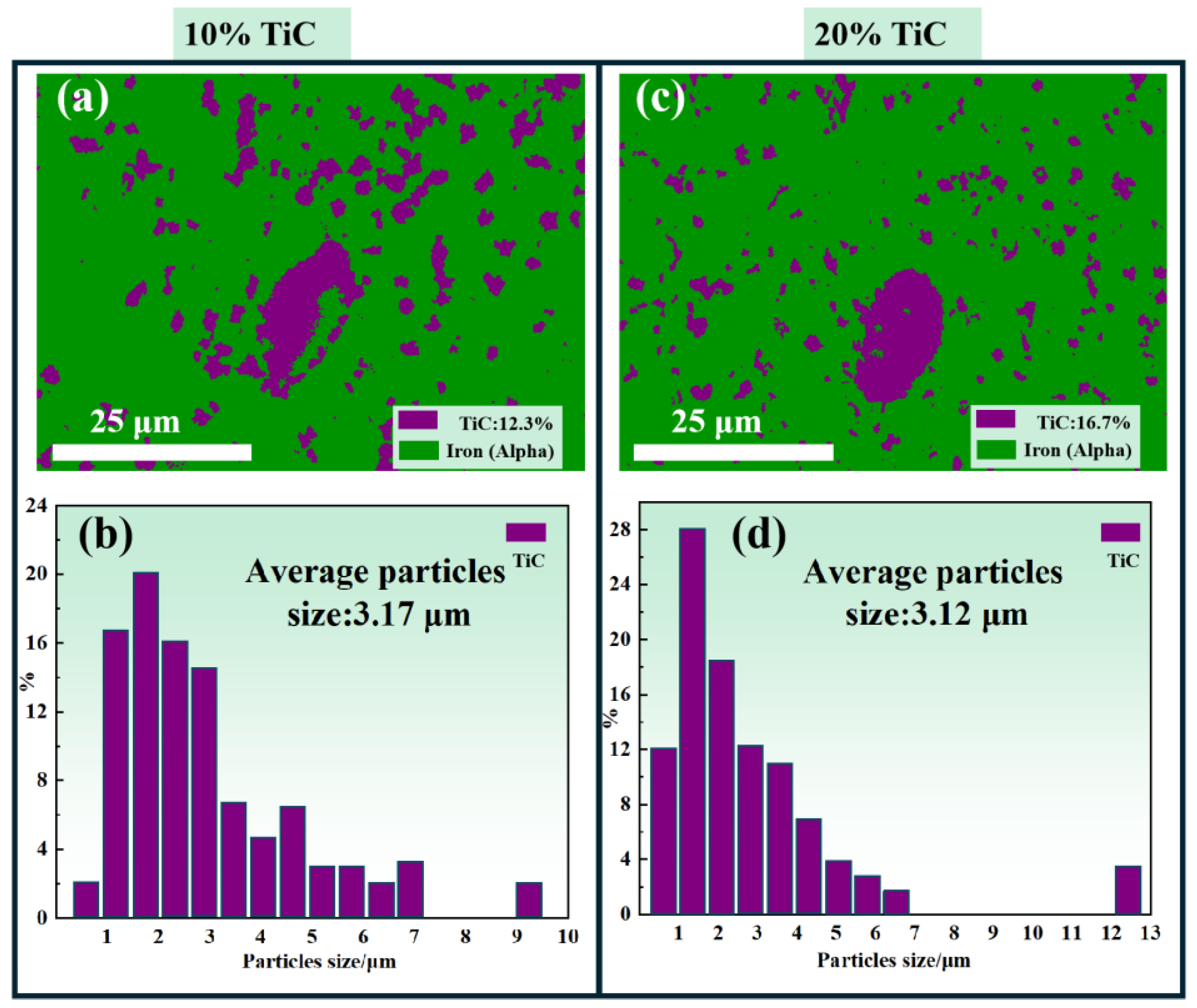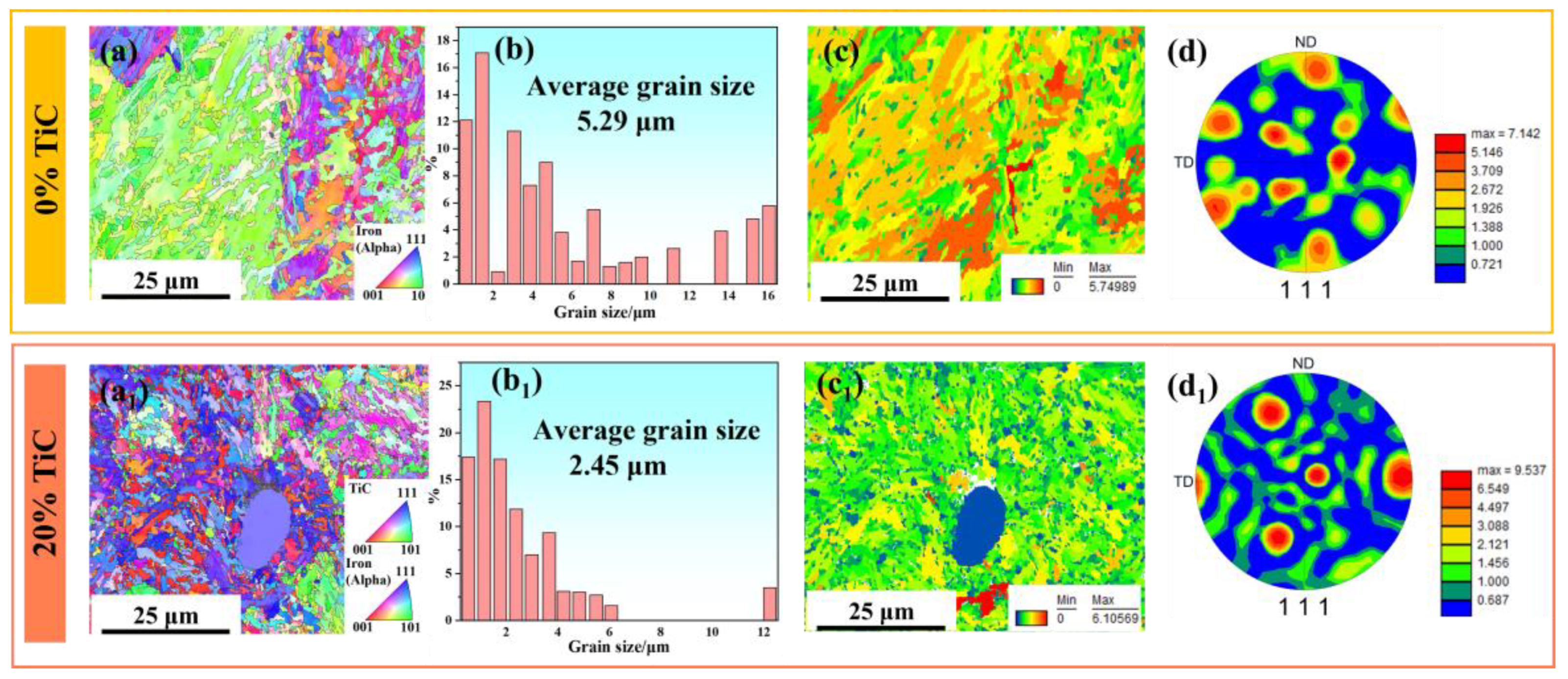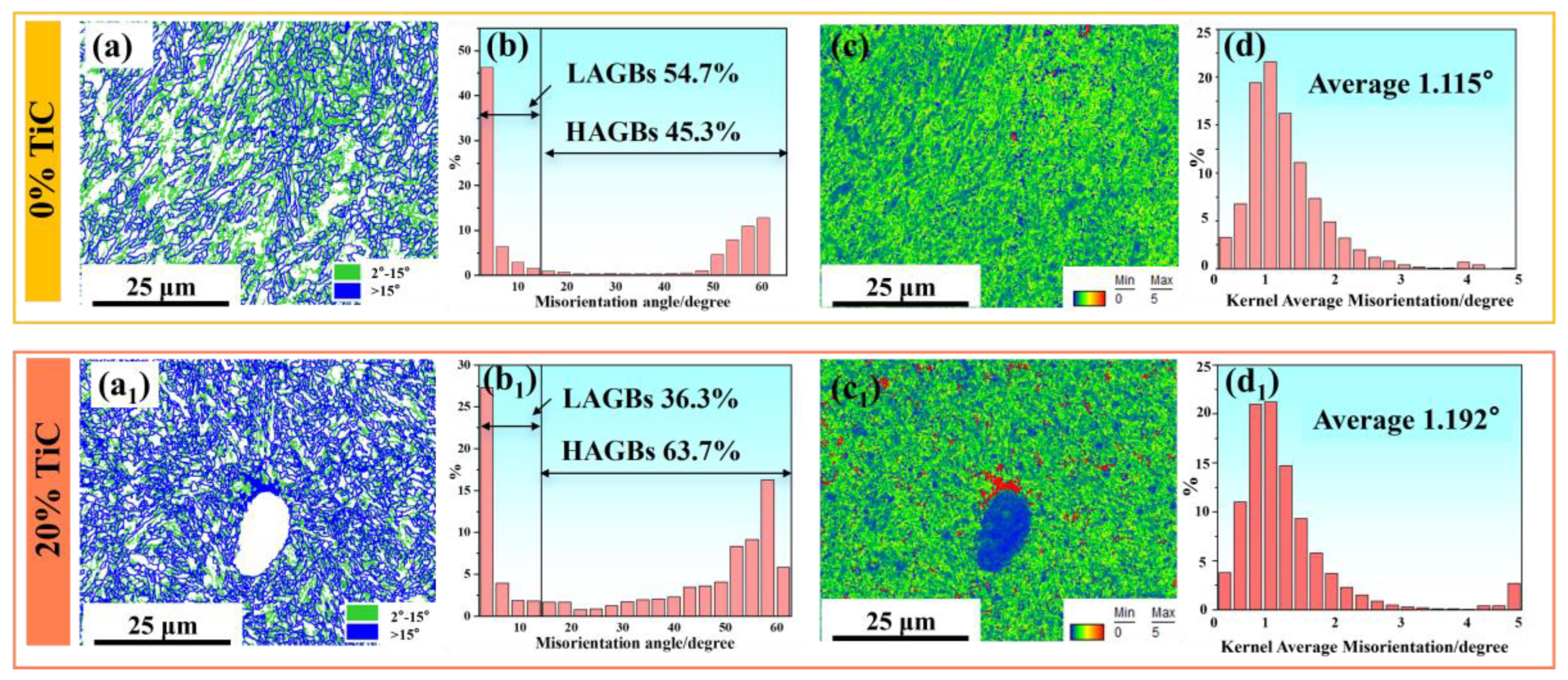 - The addition of TiC enhances grain refinement, increases the recrystallization and HAGBs fractions, and elevates dislocation density. These microstructural features also improve the mechanical properties and wear resistance of the coatings.