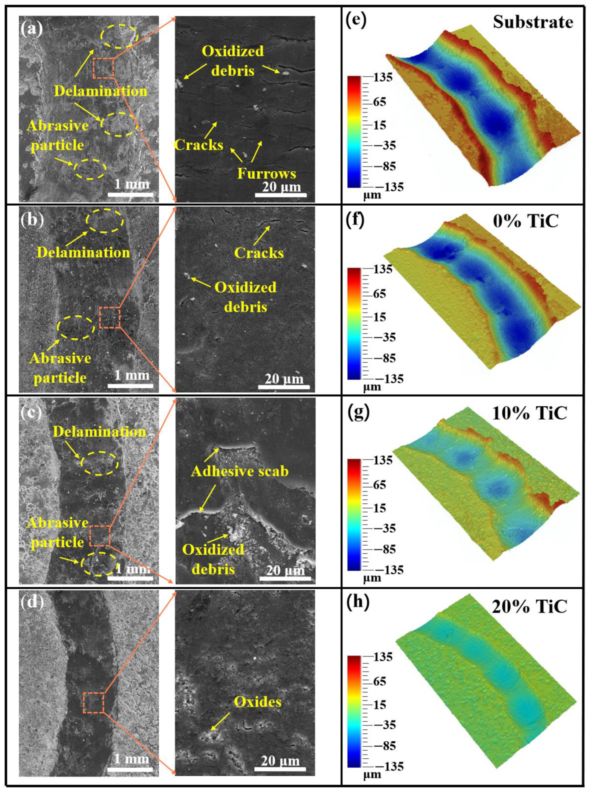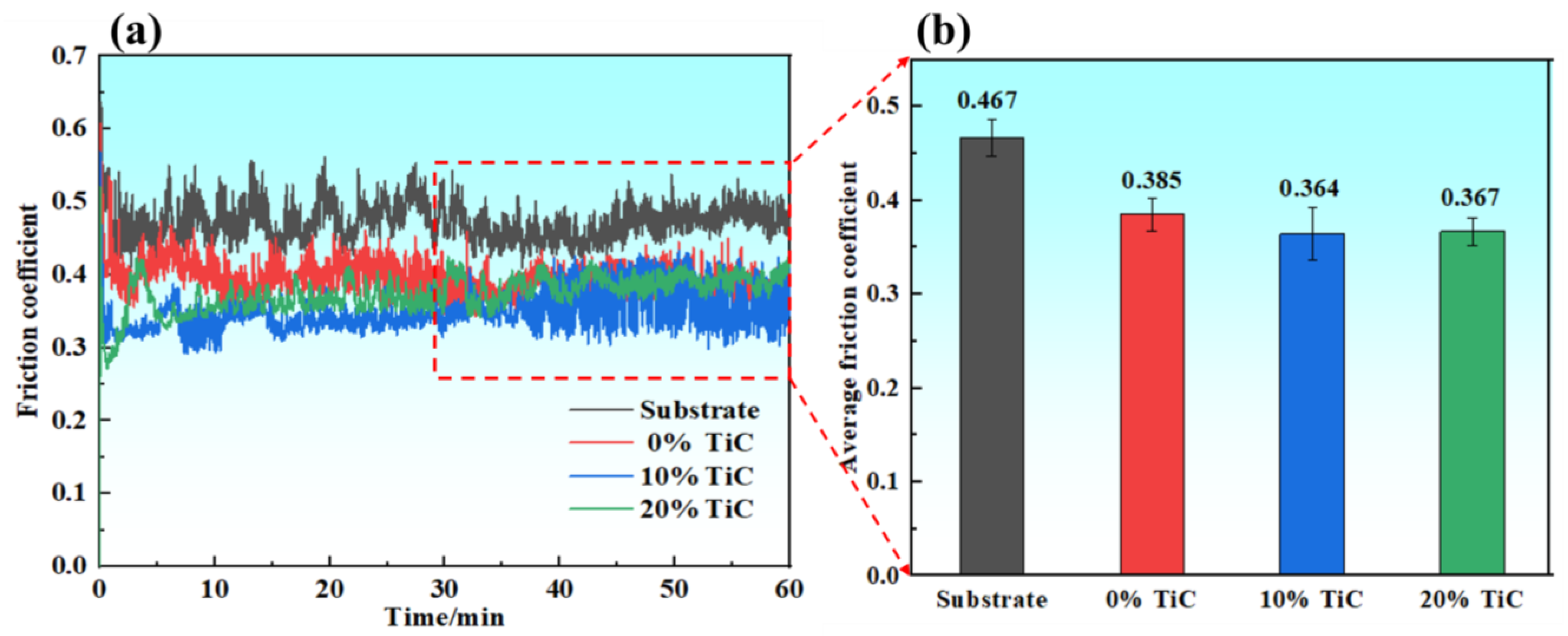 - The coating with 20% TiC demonstrates the optimum high-temperature tribological performance. The average friction coefficient decreases from 0.467 for the as-annealed substrate to 0.367. The wear track depth is markedly reduced from 142 μm to 20 μm, while the width decreases from 2000 μm to 1000 μm. The worn surface of the coating presents shallower grooves, fewer oxidative debris, and a smoother morphology, confirming the remarkable enhancement in wear resistance.