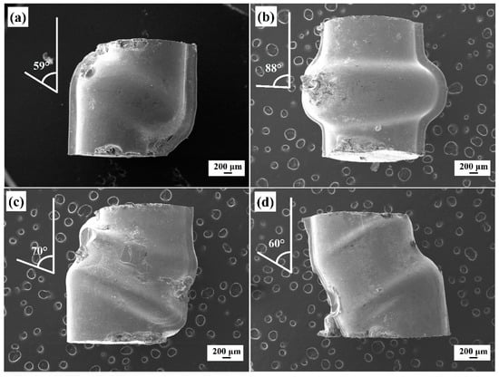 Table 3. It is observed that with increasing compression temperature, the angle first increases and then decreases, reaching a maximum value of 88° at 507 °C. This trend is exactly opposite to the variation in compressive strength with temperature. The lower the compressive strength, the higher the plastic deformability of the bulk metallic glass.
