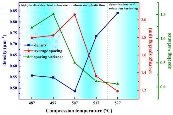 Figure 6. The analysis included measurements of shear band density, spacing, and spacing variance. Shear band density is defined as the number of shear bands per unit length along a direction perpendicular to the shear bands in SEM images. This parameter reflects the degree of deformation homogenization. The higher the shear band density, the more uniform the deformation. The formula for calculating the shear band density,