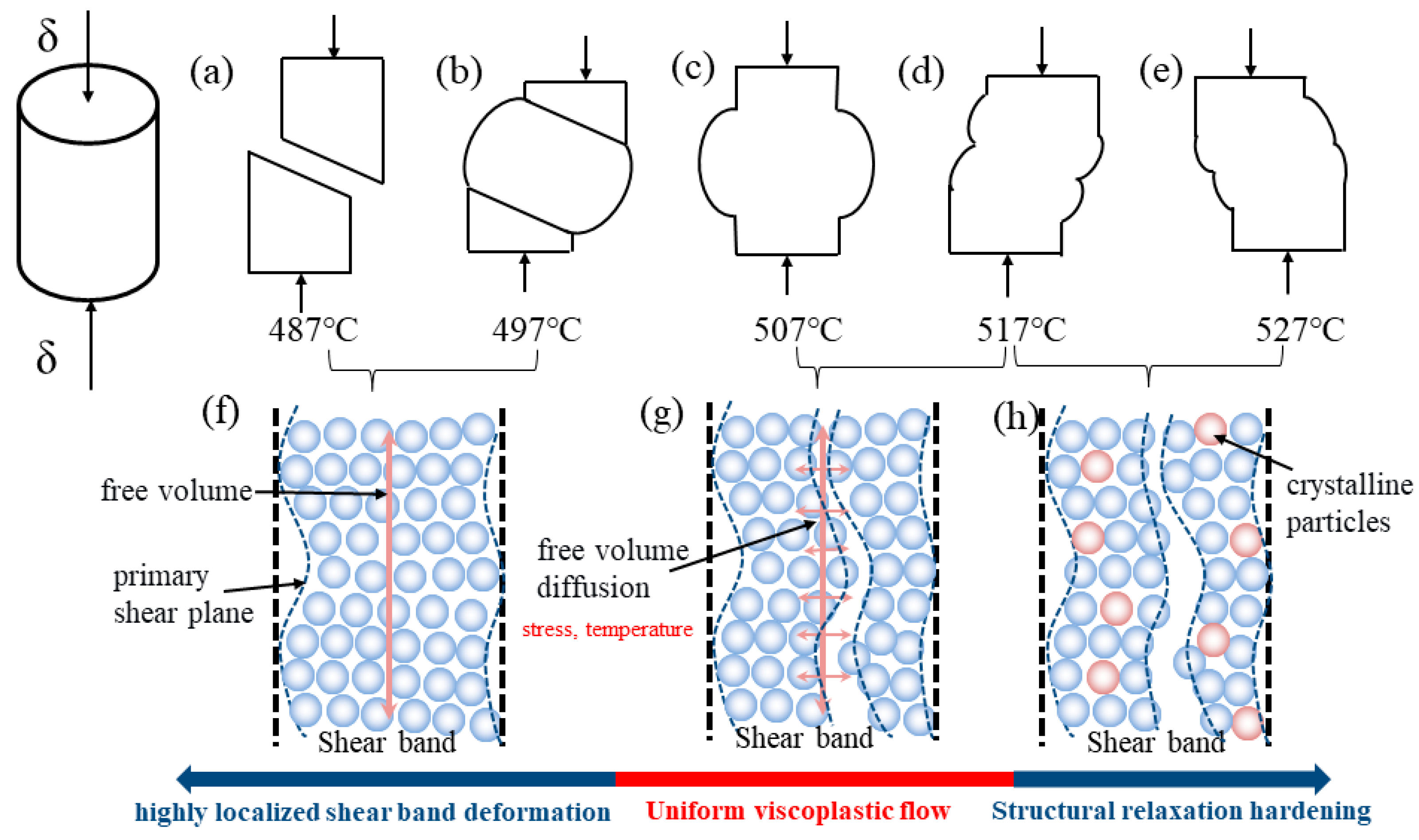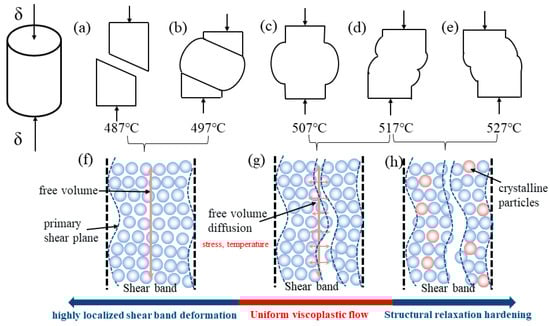 Figure 8g, the deformation mechanism schematic for the BMGs at 507–517 °C indicates that the shear band spacing decreases and deformation becomes more uniform. This leads to uniform deformation dominated by viscoplastic flow, driven by free-volume diffusion in response to temperature and stress. At compression temperatures of 517–527 °C (above the onset crystallization temperature,