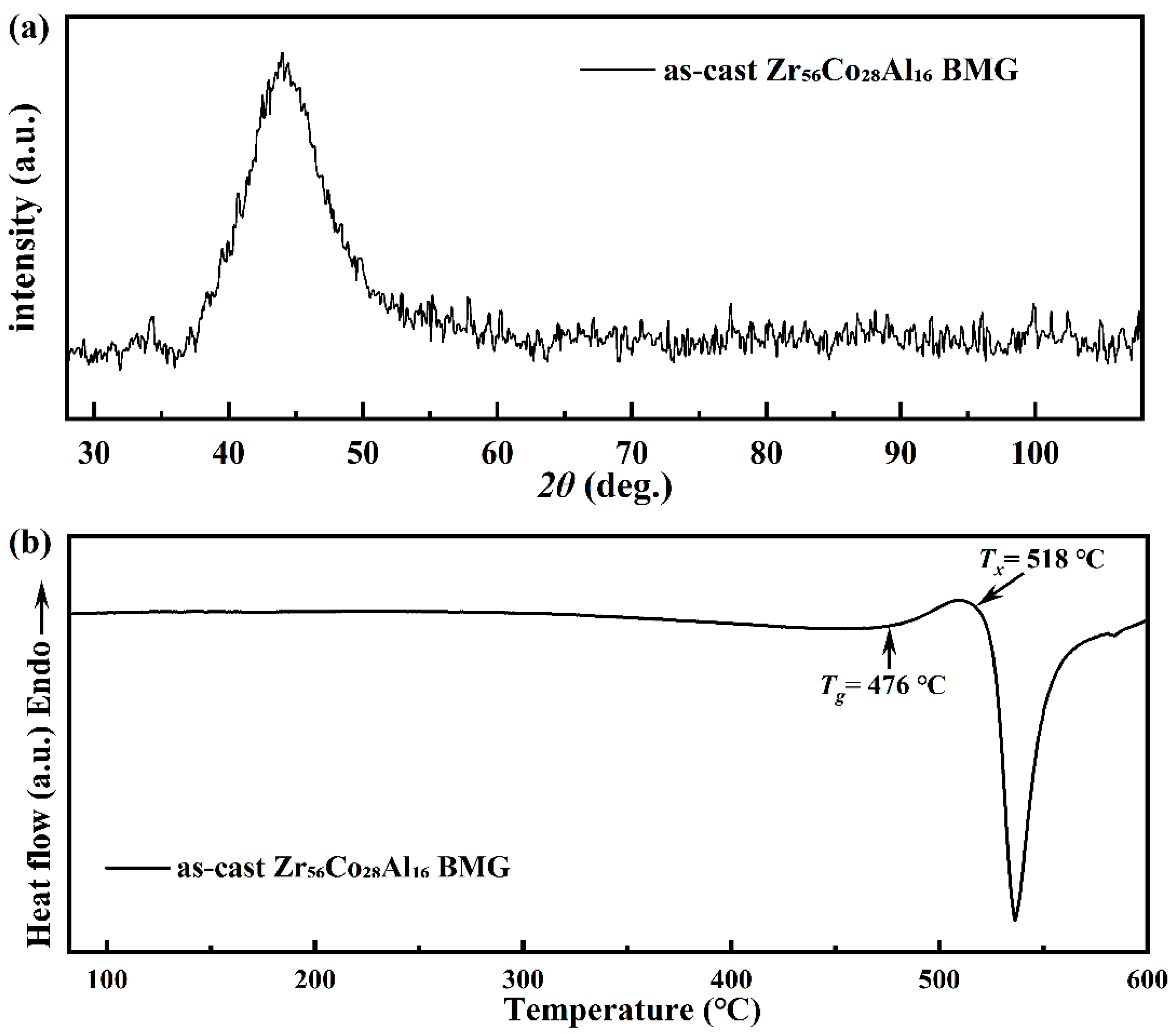 T = 42 °C. These thermal characteristics not only further confirm the amorphous nature of the as-cast samples but also provide a direct basis for selecting the deformation temperatures within the supercooled liquid region.