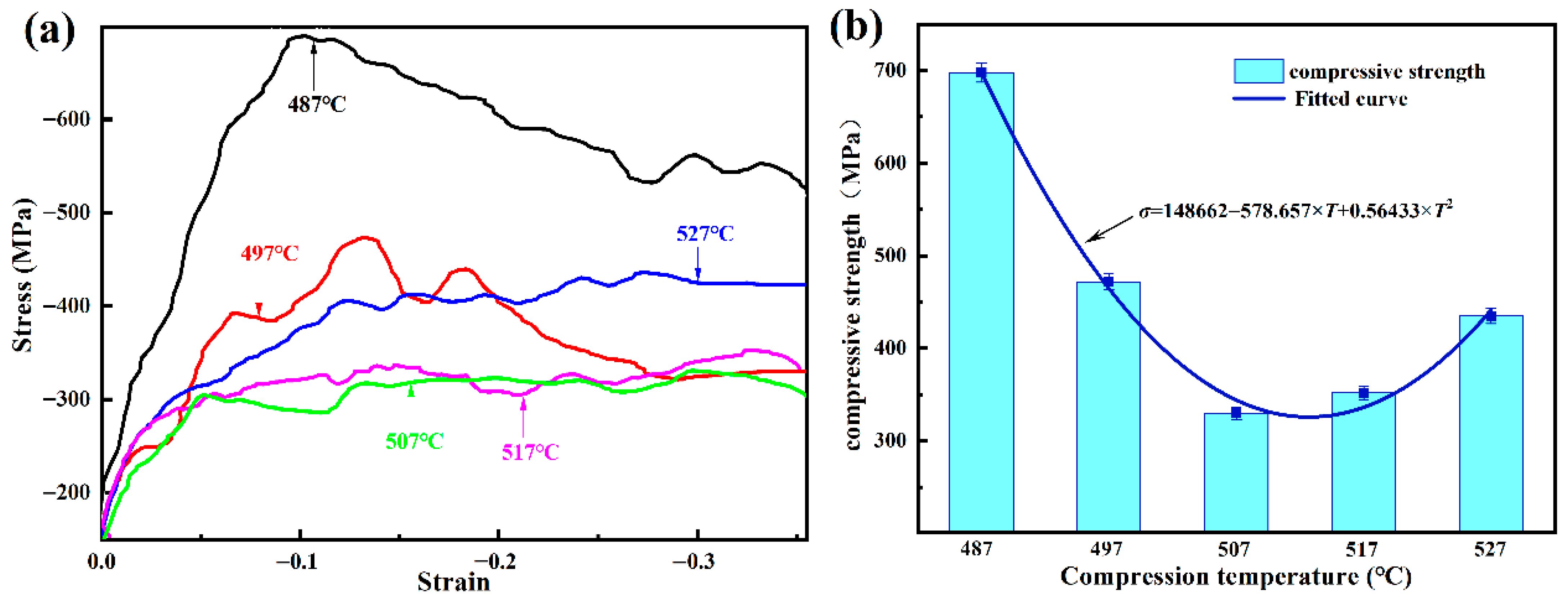 Figure 2b. From this fitting, it was found that with increasing compression temperature, the compressive strength first decreases and then increases, exhibiting a parabolic trend. The minimum peak stress occurs at around 510 °C, which is not the midpoint temperature of the supercooled liquid region. This deviation may be attributed to stress inhomogeneity within the bulk metallic glass during compression. This binomial relationship provides theoretical guidance for processing the bulk metallic glass within its supercooled liquid region.