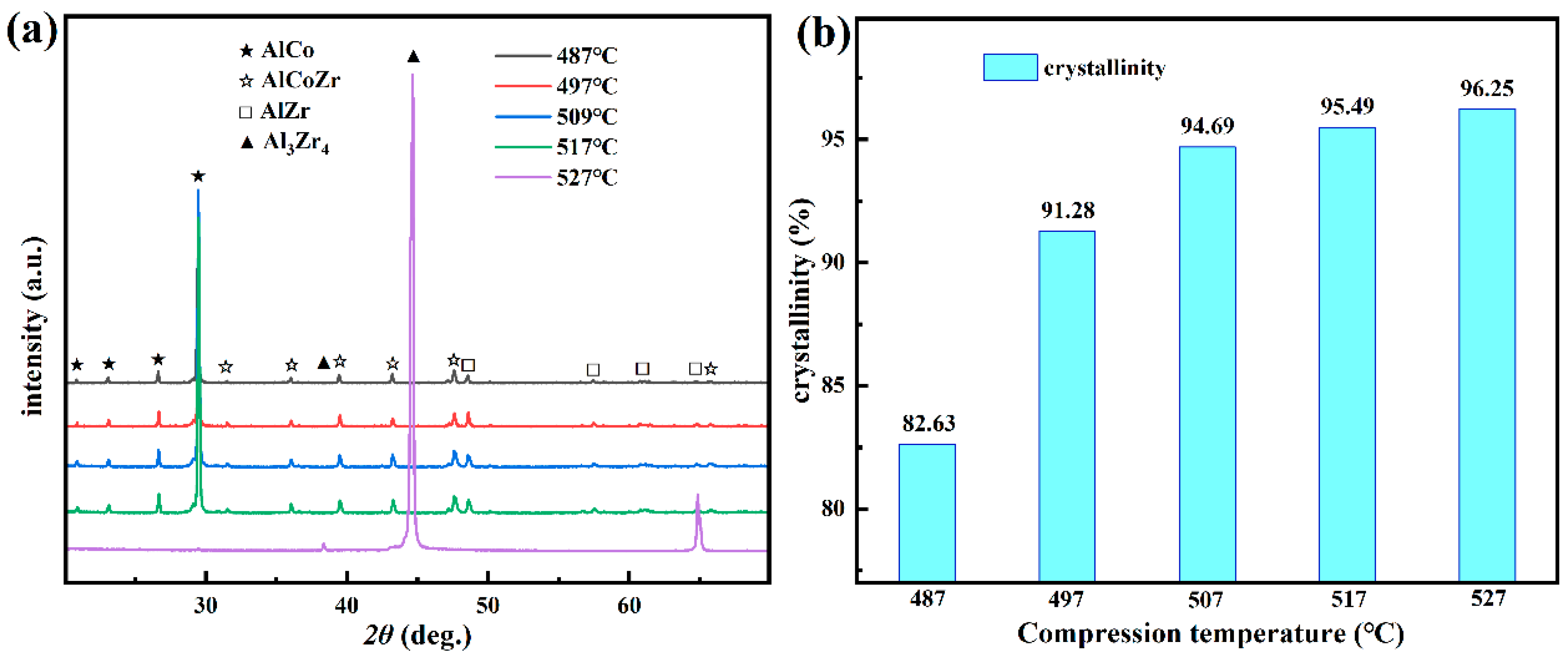 Figure 3a. It was found that within the compression temperature range of 487–517 °C (below the onset crystallization temperature), the crystalline phases in the Zr