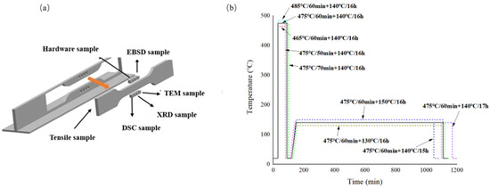 Schematics of the (a) positions of samples extracted from the TiB2/7050 composite stringer and (b) heat treatment comprising solution and artificial aging.