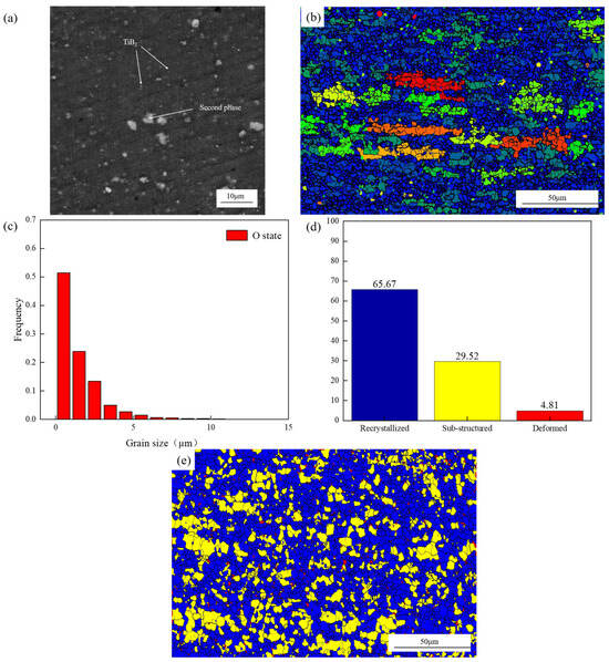 Microscopic characteristics of O-state TiB2/7050 composite material: (a) SEM microscopic morphology; (b) EBSD grain size distribution map; (c) frequency statistics of grain size; (d) size of the recrystallized grains graph; (e) recrystallization ratio statistical.