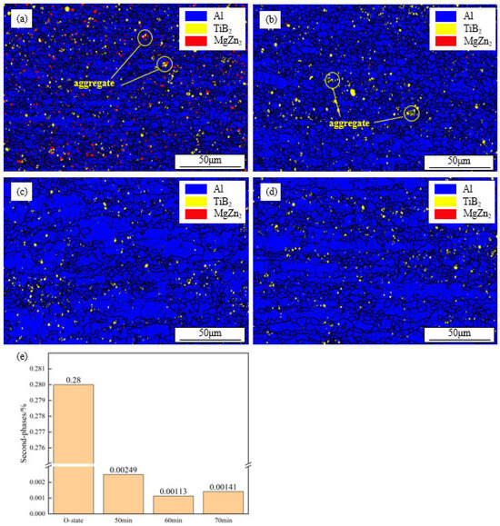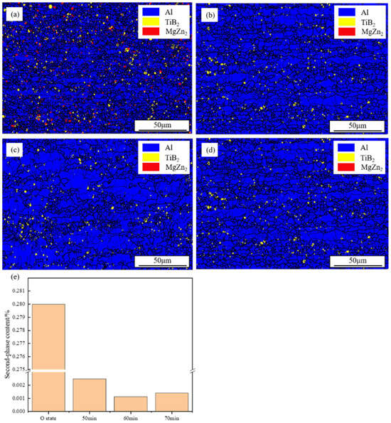 As shown in Figure 8a, the O-state material contains a large number of coarse second phases (MgZn2). These coarse second phases are usually generated through casting or hot extrusion processes. After solid solution treatment, the second phases dissolve, but the TiB2 particles still exist in the form of aggregates. The aggregates are prone to causing cracks when subjected to external forces. As can be seen from Figure 8a,e, the maximum diameter of the soluble second phase in the O-state structure is 2.76 μm, the average diameter is 0.55 μm, and the volume fraction is 2.8%. After solid solution treatment, the proportion of the soluble second phase decreases rapidly, and at 475 °C, the proportion of the soluble second phase has dropped to 0.00113%. During the solid solution treatment process, the second phases dissolve, thereby reducing the size and volume fraction of these phases to improve the material’s properties.
