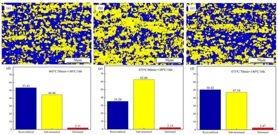 Recrystallization grain distribution map of the TiB2/7050 composite: (a) 465 °C/60 min + 140 °C/16 h, (b) 475 °C/60 min + 140 °C/16 h, (c) 485 °C/60 min + 140 °C/16 h; statistics of recrystallized fraction and structure size of the TiB2/7050 composite: (d) 465 °C/60 min + 140 °C/16 h, (e) 475 °C/60 min + 140 °C/16 h, (f) 485 °C/60 min + 140 °C/16 h.