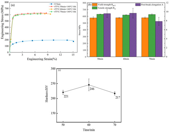 (a) Engineering stress–engineering strain curves of samples, (b) changes of mechanical properties of TiB2/7050 composites, (c) hardness changes of TiB2/7050 composites at different solution times: 50 min, 60 min, 70 min.