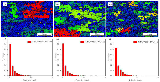 EBSD maps of the TiB2/7050 composite: (a) 475 °C/60 min + 130 °C/16 h, (b) 475 °C/60 min + 140 °C/16 h, (c) 475 °C/60 min + 150 °C/16 h; grain size distribution of the TiB2/7050 composite: (d) 475 °C/60 min + 130 °C/16 h, (e) TiB2/7050 composite at 475 °C/60 min + 140 °C/16 h, (f) 475 °C/60 min + 150 °C/16 h.