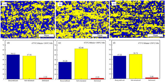 Recrystallization grain distribution map of the TiB2/7050 composite: (a) 475 °C/60 min + 130 °C/16 h, (b) 475 °C/60 min + 140 °C/16 h, (c) 475 °C/60 min + 150 °C/16 h; statistics of recrystallized fraction and structure size of the TiB2/7050 composite: (d) 475 °C/60 min + 130 °C/16 h, (e) 475 °C/60 min + 140 °C/16 h, (f) 475 °C/60 min + 150 °C/16 h.