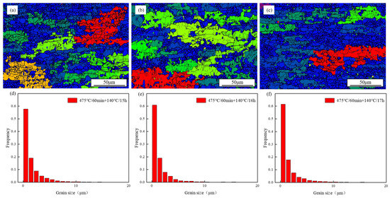 EBSD maps of the TiB2/7050 composite: (a) 475 °C/60 min + 140 °C/15 h, (b) 475 °C/60 min + 140 °C/16 h, (c) 475 °C/60 min + 140 °C/17 h; grain size distribution of the TiB2/7050 composite: (d) 475 °C/60 min + 140 °C/15 h, (e) 475 °C/60 min + 140 °C/16 h, (f) 475 °C/60 min + 140 °C/17 h.