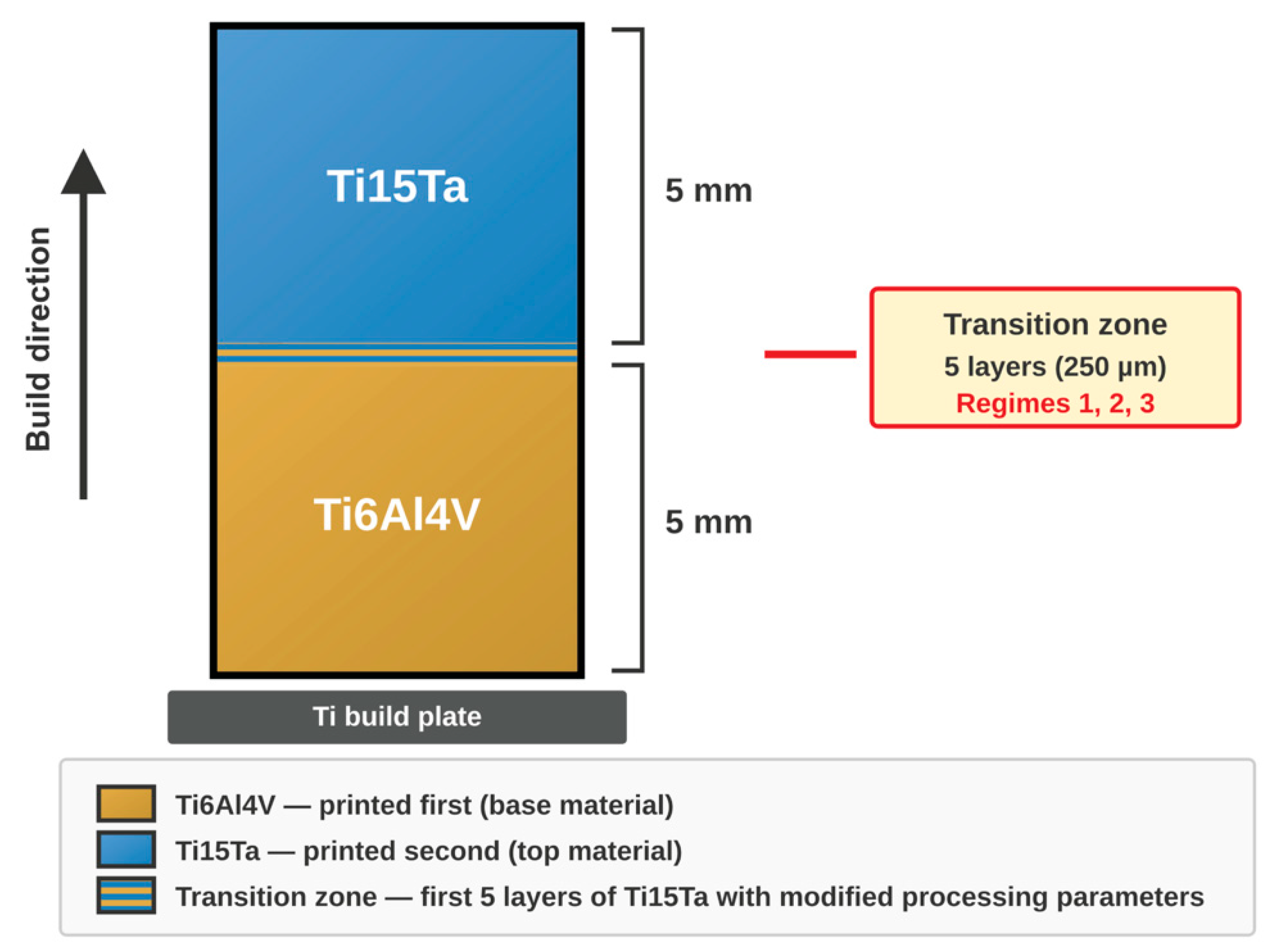 | Ti6Al4V/γ-TiAl | L-PBF, sequential deposition | Gradient interface ~250 μm achieved | Fabrication failed due to cold cracking of γ-TiAl; not suitable for biomedical applications | [30] |