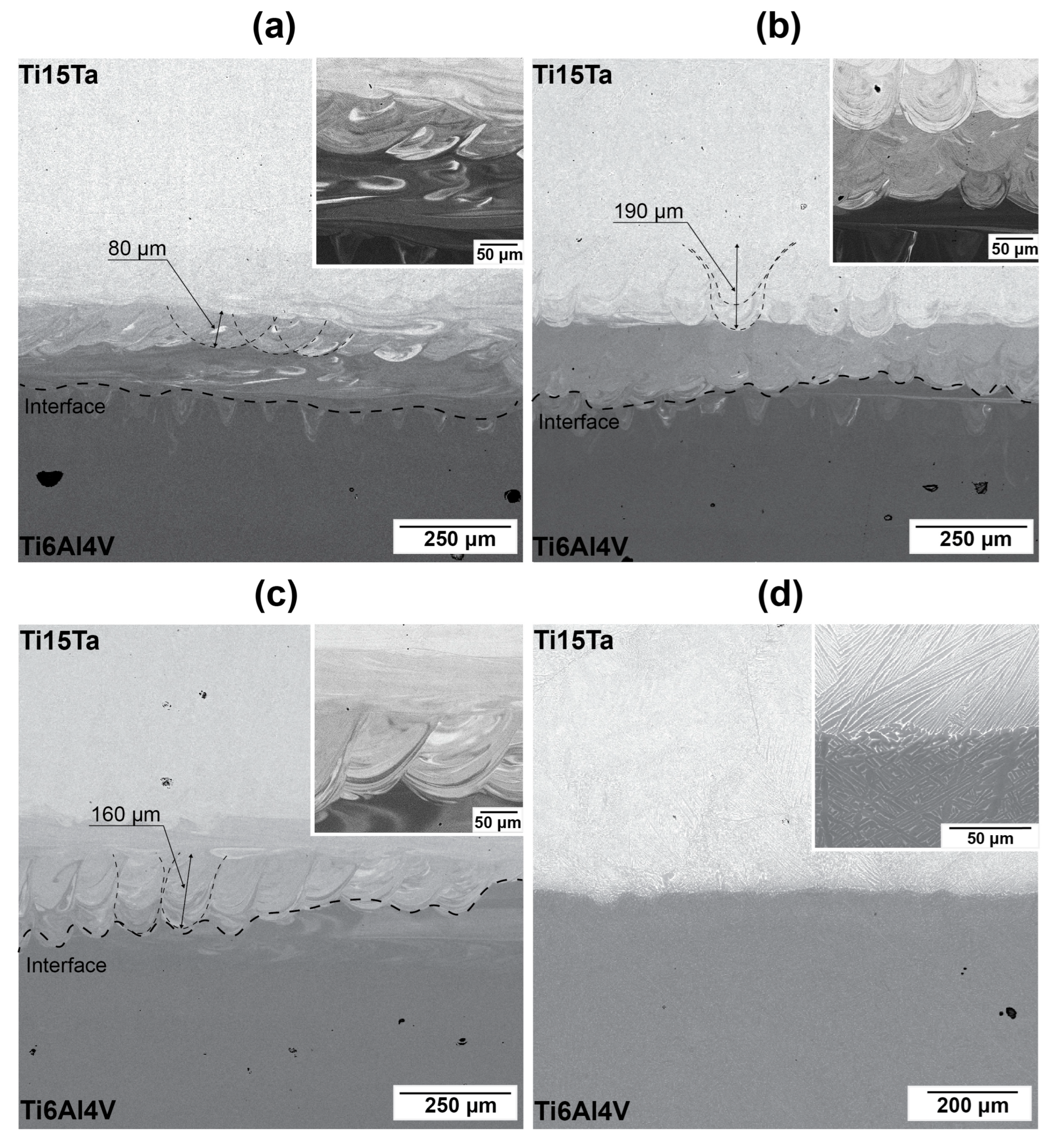 - Polozov, I.; Gracheva, A.; Popovich, A. Interface Characterization of Bimetallic Ti-6Al-4V/Ti2AlNb Structures Prepared by Selective Laser Melting. Materials 2022, 15, 8528. [Google Scholar] [CrossRef]