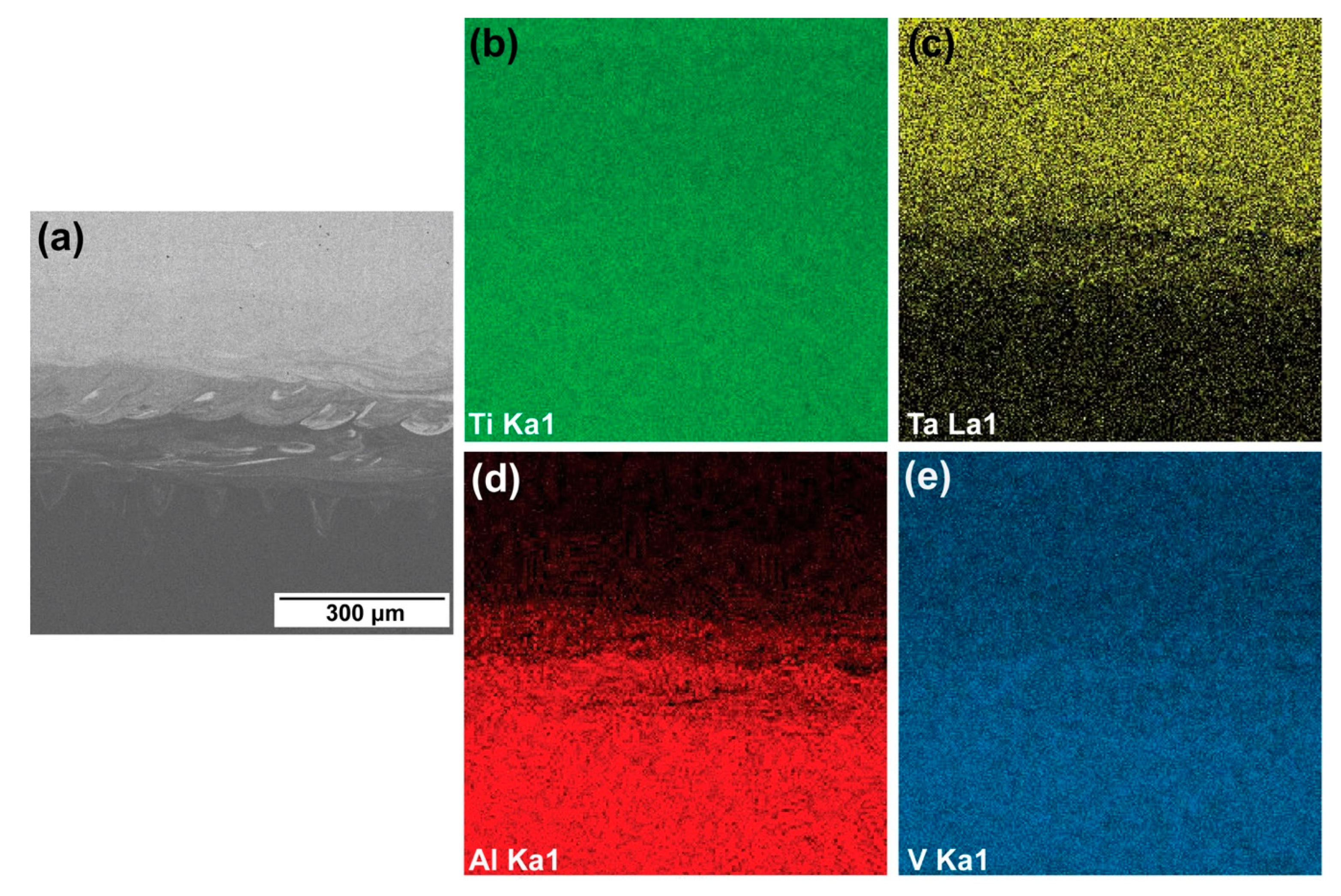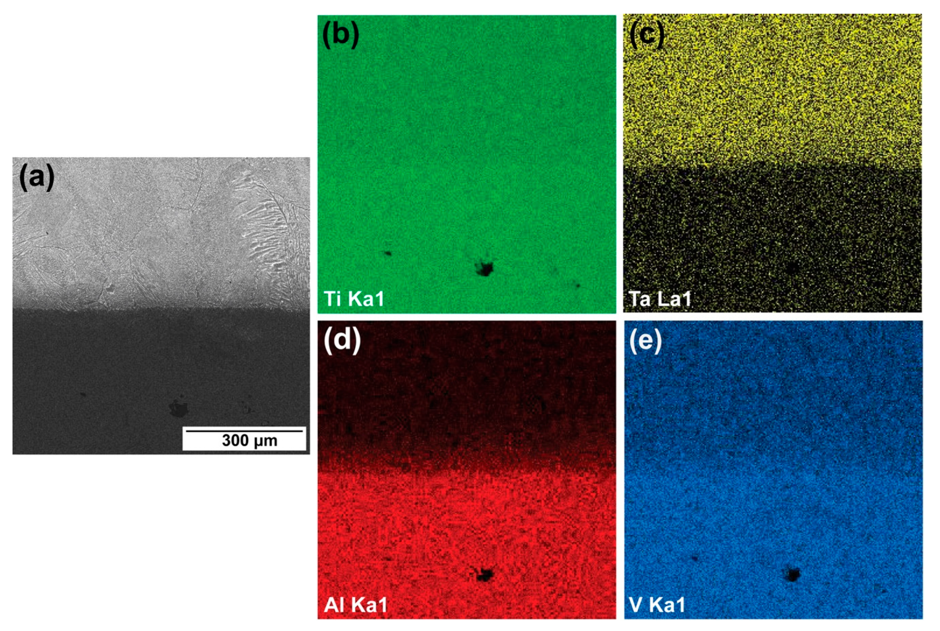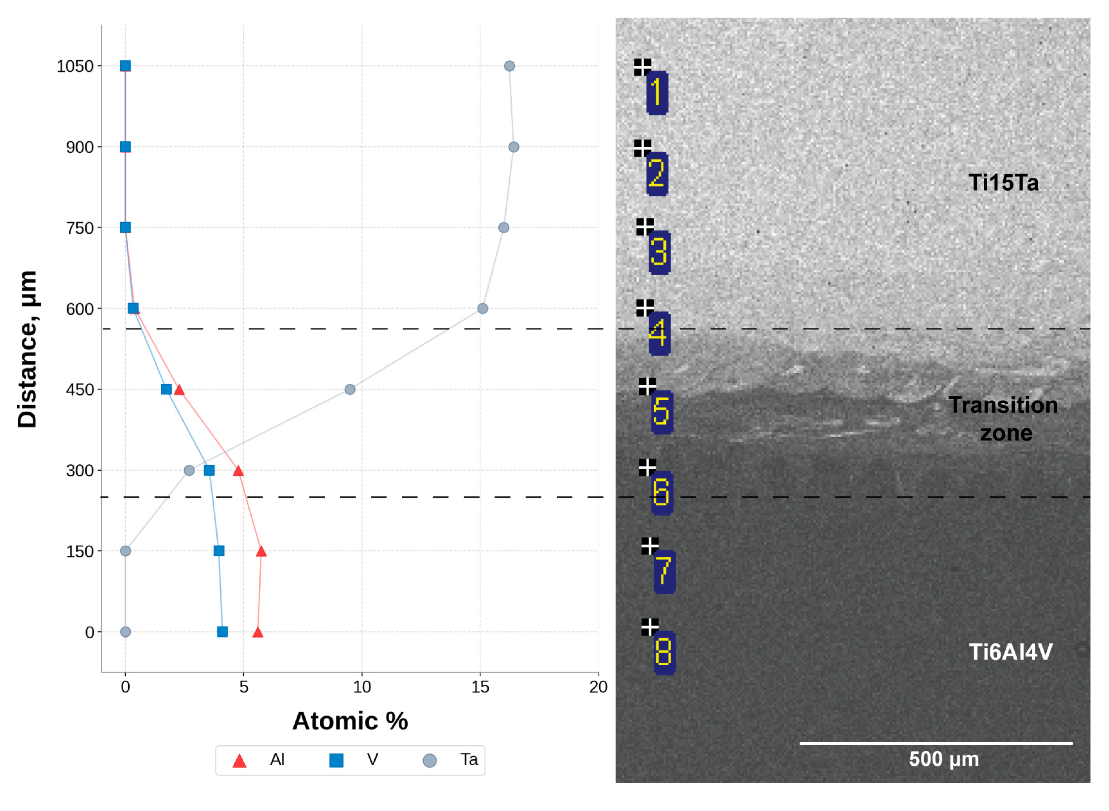 - Microstructural features. In the as-built condition, the transition zone is characterized by a wavy interface, the morphology of which is defined by the melt pool geometry. EDS mapping revealed incomplete compositional homogenization with localized Ta-enriched regions. Heat treatment at 875 °C for 2 h leads to the formation of a smooth interface with a gradual elemental concentration gradient, indicating the effective progression of diffusion processes.