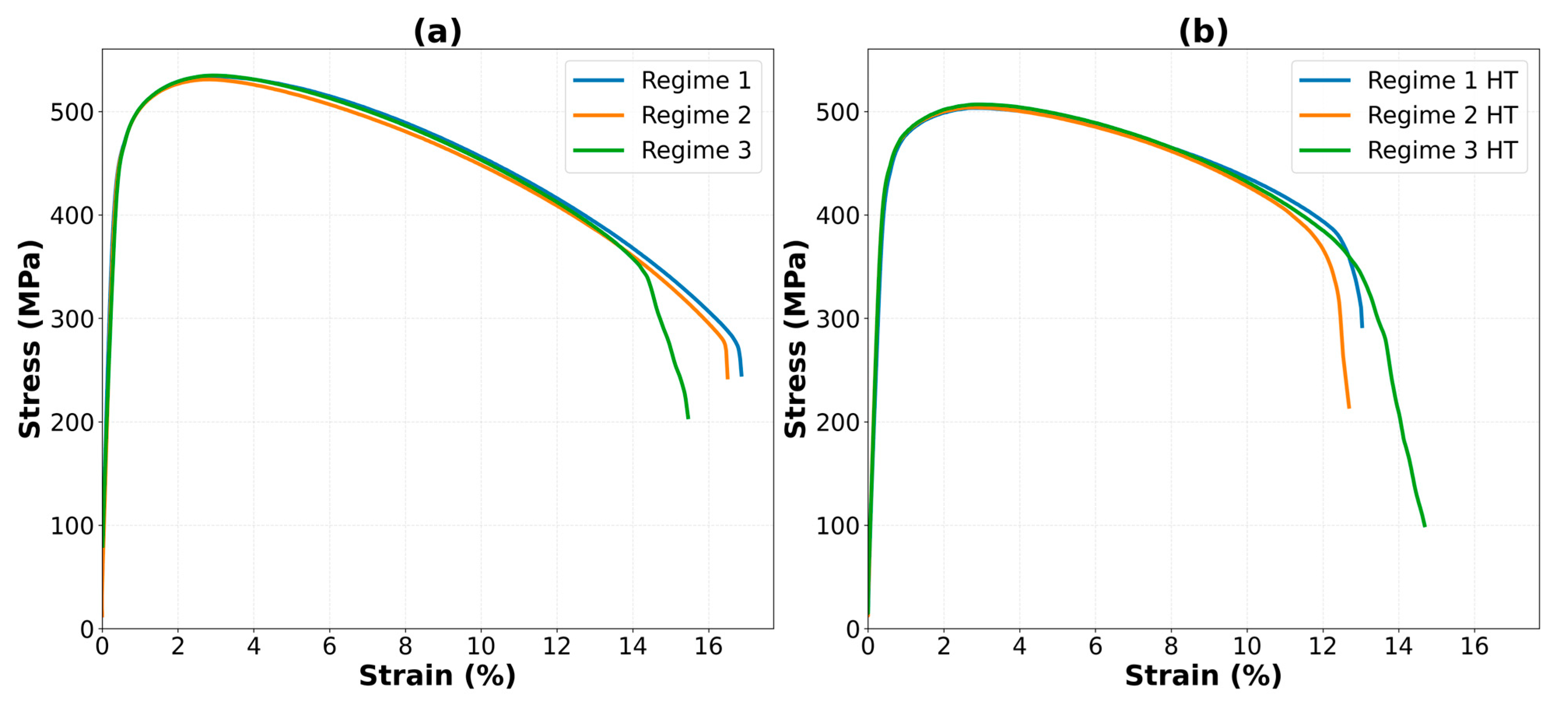 | Regime/Alloy | Elastic Modulus (GPa) | Yield Strength (MPa) | Tensile Strength (MPa) | Elongation (%) | Reduction in Area (%) | References |