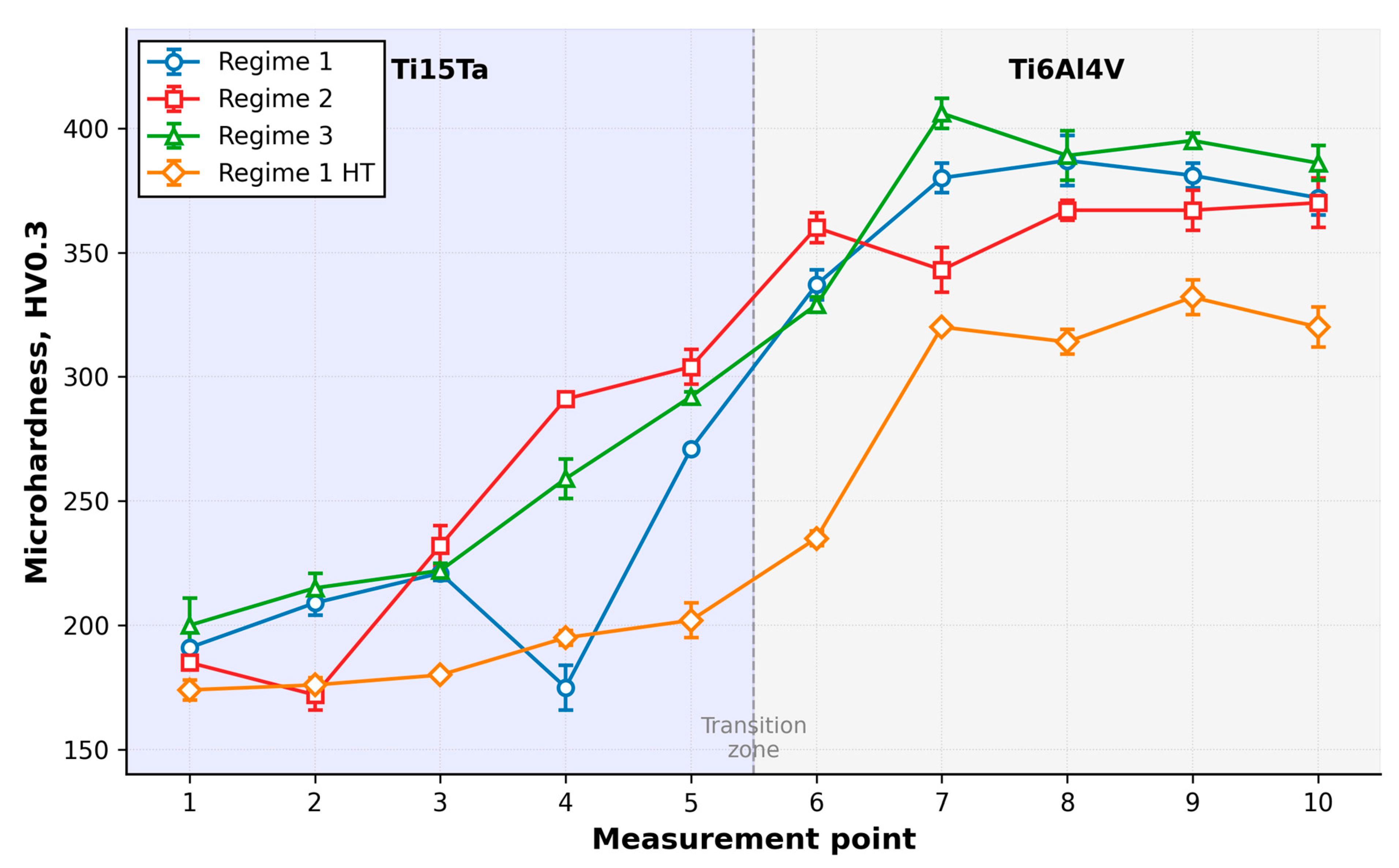 | Microhardness (HV0.3) | Regime 1 | Regime 2 | Regime 3 | Regime 1 HT |