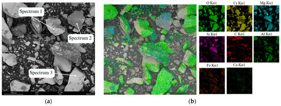 Energy dispersive spectroscopy (EDS) image of chrome concentrate: (a) spectral analysis of chrome concentrate; (b) distribution map of elements in chrome concentrate.