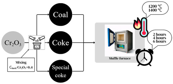 Pre-reduction annealing was performed in a laboratory muffle furnace SNOL (SnolTherm, UAB, Narkūnai, Lithuania) with a maximum operating temperature of 1600 °C. The charge ratio was calculated based on the stoichiometry of the basic reaction of chromium oxide and carbon: