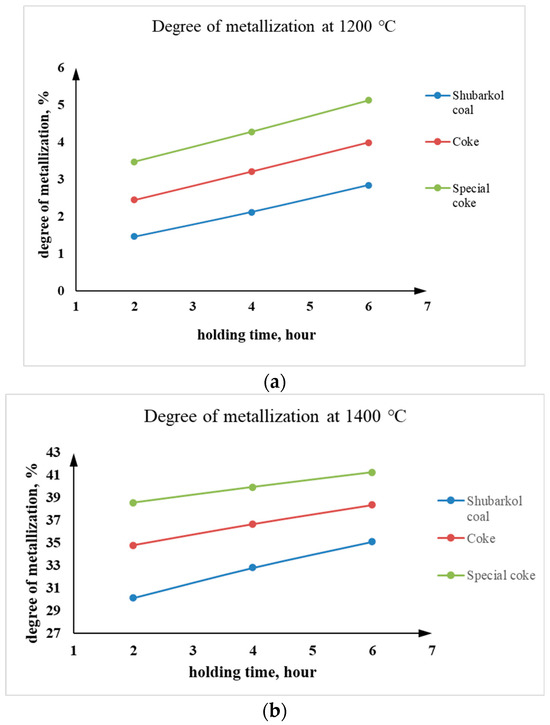 Dependence of the degree of metallization on the holding time at temperatures (a) 1200 °C and (b) 1400 °C.