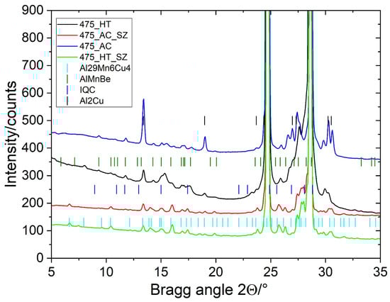 The investigations were carried out from the macro to the nano scale to study the microstructure and chemical composition systematically. The specimens were ground mechanically, polished, and etched optionally with Weck’s reagent. The macrographs were taken with an Olympus SZX10 microscope (Olympus, Tokyo, Japan). Scanning electron microscopy (SEM) with a backscatter electron (BSE) detector was used for the bulk samples to reveal the compositional differences. The SEM was performed in a JSM-IT800 SHL (Jeol, Tokyo, Japan) equipped with an energy-dispersive X-ray spectrometer (EDS) (Oxford Instruments, High Wycombe, UK). The BSE imaging and EDS analysis were carried out at an accelerating voltage of 10 kV. More about the metallography of the quasicrystalline phases is given elsewhere [27].