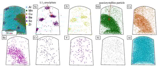 The quasicrystalline particles, both IQCs and DQCs, contained mainly Mn, with some Cu. The L12 precipitates contained Sc and Zr, while the other elements were distributed evenly in the particles and matrix (Figure 4).