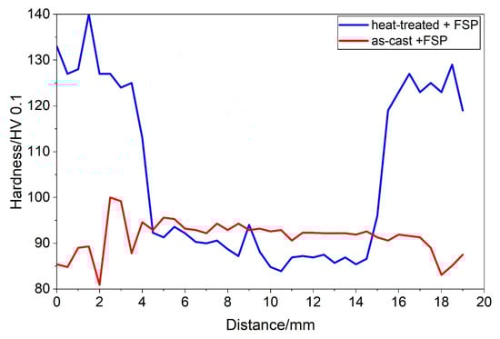 - The FSP of the as-cast sample maintained a similar hardness, but the FSP of the heat-treated sample caused a significant mechanical softening, reducing the hardness by about 25% due to precipitate dissolution and coarsening.