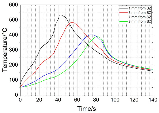 During the FSP of the heat-treated sample, the temperatures were measured at several positions. The distances to the SZ edge were measured after the metallography. Figure 8 shows the temperature profiles at four positions. The maximum temperature of 533 °C was achieved close to the SZ. The temperature exceeded 500 °C for about 10 s. The maximum temperatures decreased with increasing distance from the SZ. No temperature was measured within the SZ. We may assume that the temperature was higher than 550 °C, more likely higher than 600 °C.