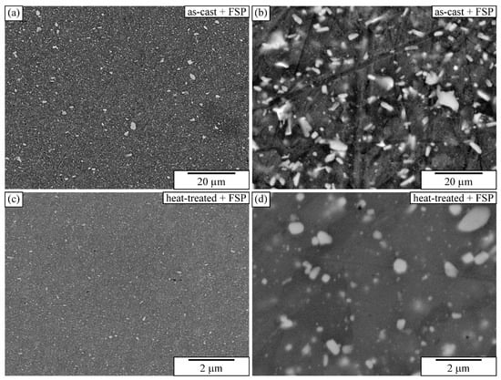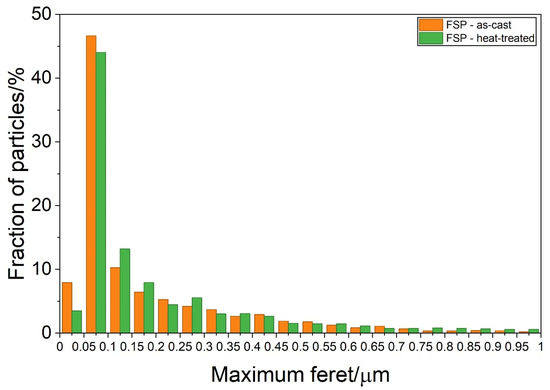Particle size distribution in the stir zone of the samples initially in the as-cast (FSP—as-cast) and heat-treated (FSP—heat-treated) conditions.