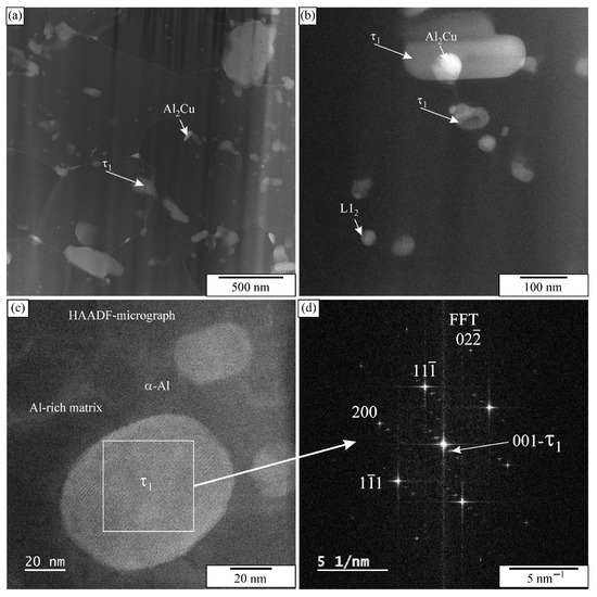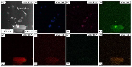 The IQC and DQC precipitates vanished from the microstructure completely during the FSP of the heat-treated sample. The Mn- and Cu-rich particles in Figure 10 are more likely the remains of the interdendritic phases than the quasicrystalline precipitates. The EDS in STEM (Figure 12) showed clearly that most of the spherical particles with sizes 45 ± 15 nm contained Sc and Zr, and can thus be identified as L12-Al3(Sc,Zr). Their number density was determined to be 3.0 × 1020 m−3, which was about two orders of magnitude lower than after heat treatment. The τ1 particles are mainly larger, in the range of 0.5–3 μm. They are mainly the result of the transformation of the previous Mn-rich phases into τ1, enabled by the Cu enrichment. Since the overall fraction of intermetallic phases increased, some precipitation of τ1 from the supersaturated solid solution was also possible. The particle in Figure 12c is a typical example.