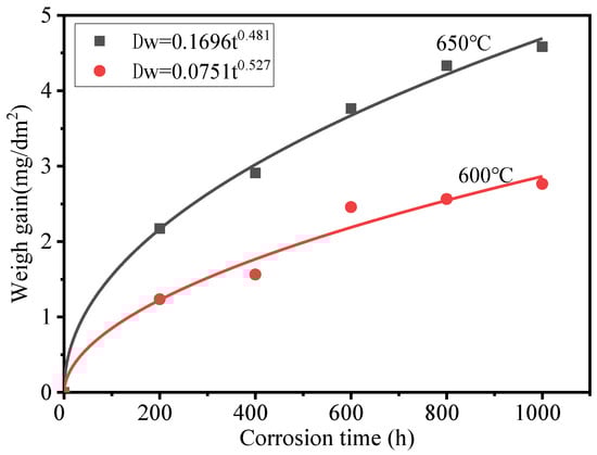 Figure 2 shows the weight gain of HR3C exposed to 600–650 °C S−CO2 at 25 MPa. The weight gain can be fitted using oxidation laws, as shown in the following equation: