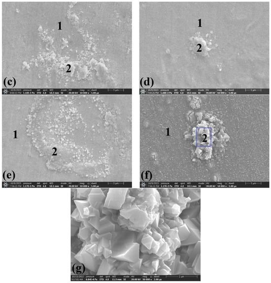 As shown in Figure 3a,d, the alloy surface is covered with uniformly small oxide particles. With prolonged oxidation time, larger oxide particles form on the metal surface (Figure 3b,e). Even larger oxide particles are observed on the alloy surface after 1000 h of oxidation (Figure 3c,f). Corresponding to the blue box shown in Figure 3f, Figure 3g presents a high-magnification morphology image of the nodular oxide formed on HR3C. From this surface morphology image, it can be observed that after 1000 h of oxidation in S-CO2 at 650 °C, the oxide exhibits a polyhedral grain morphology and pores are noted.