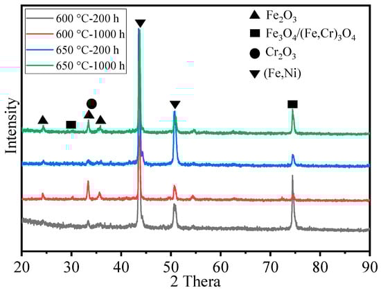 XRD spectra of HR3C steel after oxidation for 200 h and 1000 h in S-CO2 at 600 °C and 650 °C.