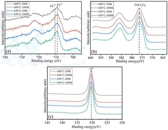 XPS patterns of the oxide film on HR3C steel after exposure to S-CO2 at 600–650 °C for 200 and 1000 h. (a) Fe 2p core-level spectra, (b) Cr 2p core-level spectra, and (c) O 1s core-level spectra.