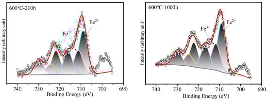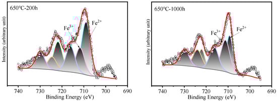 Surface analysis of the HR3C alloy oxidized in S-CO2 at 600 °C and 650 °C for varying durations was conducted using XPS to examine the elemental states of the oxide film components, including Fe, Cr, and O, and the results are presented in Figure 6. Figure 7 shows XPS patterns of Fe on HR3C steel after exposure to S-CO2 at 600–650 for 200 and 1000 h. In Figure 6a and Figure 7, the peak positions of Fe are at (709.2 ± 0.3) eV and (710.2 ± 0.3) eV, corresponding to Fe2+ and Fe3+. The corresponding oxide phase may be Fe3O4 and Fe2O3. Figure 6b displays the narrow XPS scan spectra of Cr after different sputtering times. On the surface of the oxide film, the Cr peak is located at (576.6 ± 0.2) eV, corresponding to FeCr2O4. Figure 6c shows the O spectrum with a binding energy of (530.5 ± 0.2) eV, corresponding to O2−.
