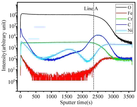 Figure 8, Figure 9, Figure 10 and Figure 11 show the element distribution obtained by selecting a 70 × 70 μm2 area of the sample for scanning using Cs with a 2 keV sputtering ion beam to conduct in-depth analysis. The concentration profiles of the sample surface are indicated in Figure 8, which shows that the oxide surface is rich in Cr and O, while the content of Fe is low. C and Ni are also observed to be present in the oxide surface. Figure 9 shows the relationship between sputtering time and elemental distribution intensity. The sputtering time can be regarded as a proxy for the depth of the specimen, which means that as the sputtering time increases deeper elemental compositions of the material can be detected. It can be seen from Figure 9 that the content of O is high and remains constant for sputtering times of less than 2370 s. The oxygen content continuously decreases from the location of the line marked A to the base alloy, indicating the existence of an inward gradient of diffusion of oxygen. A small quantity of the element Fe was detected at the outermost layer, while it was absent from the oxide scale. The highest carbon content is located at the interface between the oxide and the metallic bulk and at the outermost oxide layer. The distribution of Cr in the two-dimensional diagram is relatively uniform, and the concentration of Cr has an obvious peak in the intermediate region, which indicates that chromium enrichment at a certain depth of the oxide layer is present. In HR3C, a small amount of Cr scale can be observed under the oxide, indicating an outward diffusion of Cr. Combined with the data in Figure 5, it can be concluded that the peak of Cr is related to the formation of Cr2O3, i.e., it is related to stable oxides that can improve the corrosion resistance of a material [20].