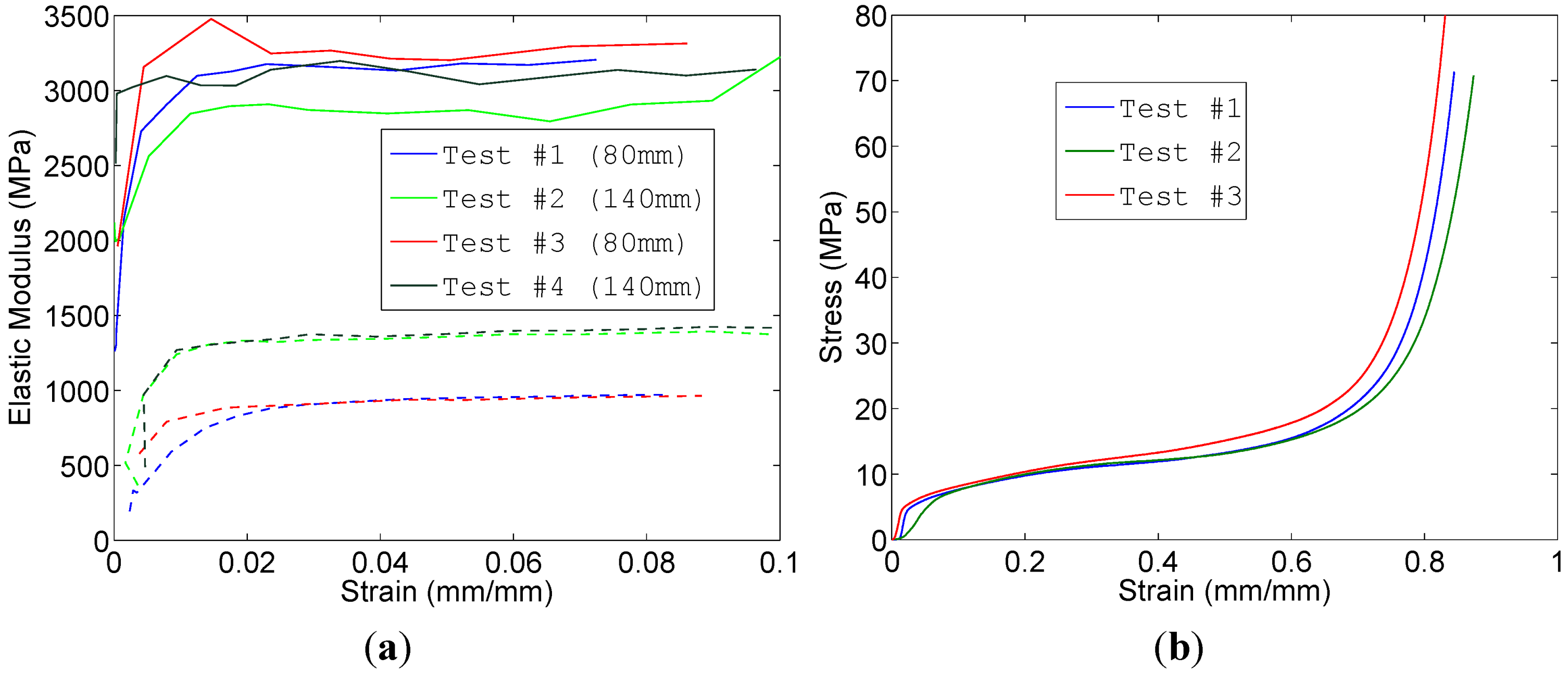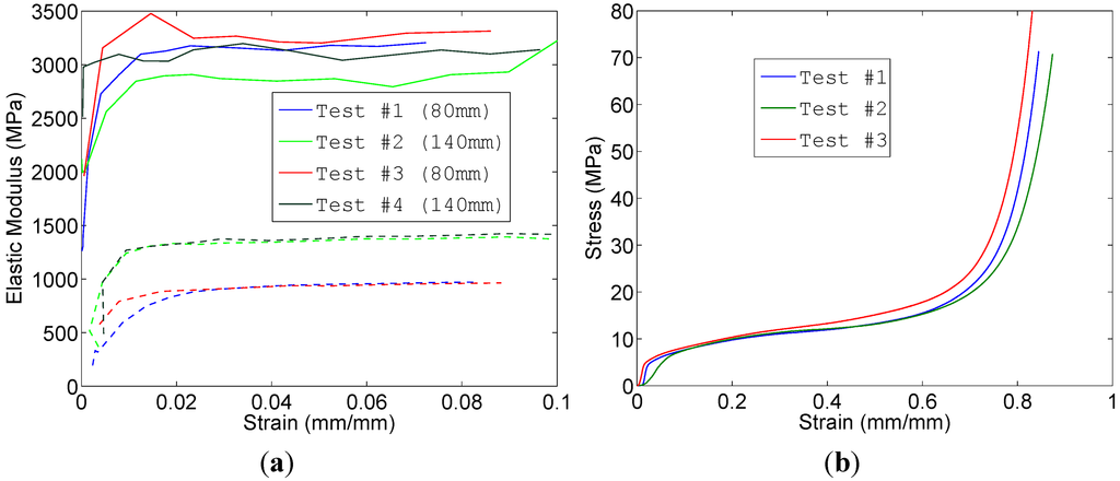 (a) Elastic modulus vs. strain, as measured from unloadings (test type 3). Upper solid lines represent measurements from the extensometer, lower dashed lines are from crosshead displacement; (b) stress-strain curves for tests up to densification (test type 4).