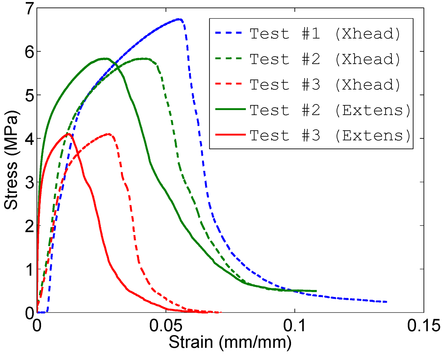 Tensile stress-strain graph showing crosshead and extensometer measurements.