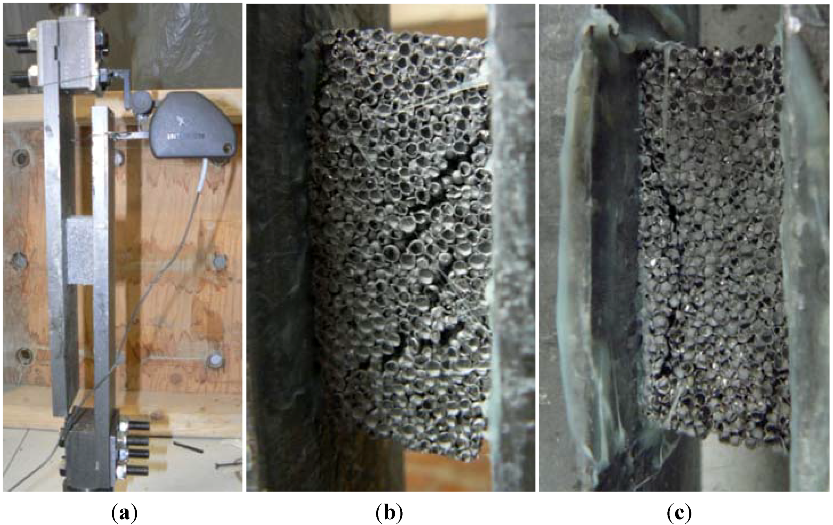 (a) The full shear test setup;(b) shear specimens #1;(c) and #2 (right) at about 0.08 strain, clearly showing shear cracks.