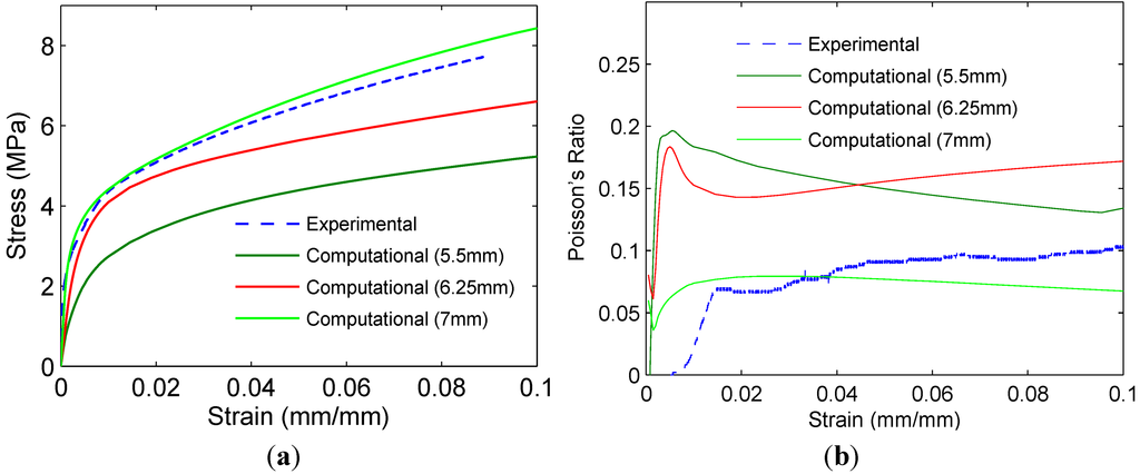 Similarly to experimental tests by Andrews [10], smaller samples have lower apparent strengths and stiffnesses. No known, published research has attempted to study the effect of model size upon Poisson’s ratio. The simulated Poisson’s ration decreased with the sample size. The simulations of 7 mm models match experimental engineering Poisson’s ratio with reasonable accuracy. While the experimental data is noisy, Poisson’s ratio rises with compressive strains, which indicates a gradual increase in foam incompressibility.