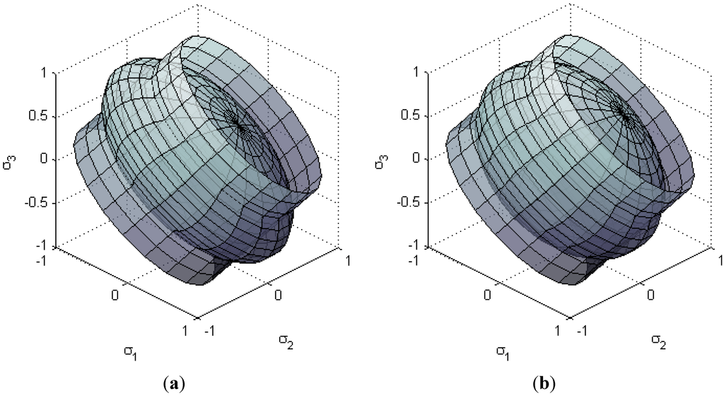 Foam plasticity: Deshpande-Fleck ellipsoid, and von Mises cylinder for comparison. (a) vp = 0.0 (α = 2.12); (b) vp = 0.2 (α = 1.5).