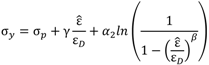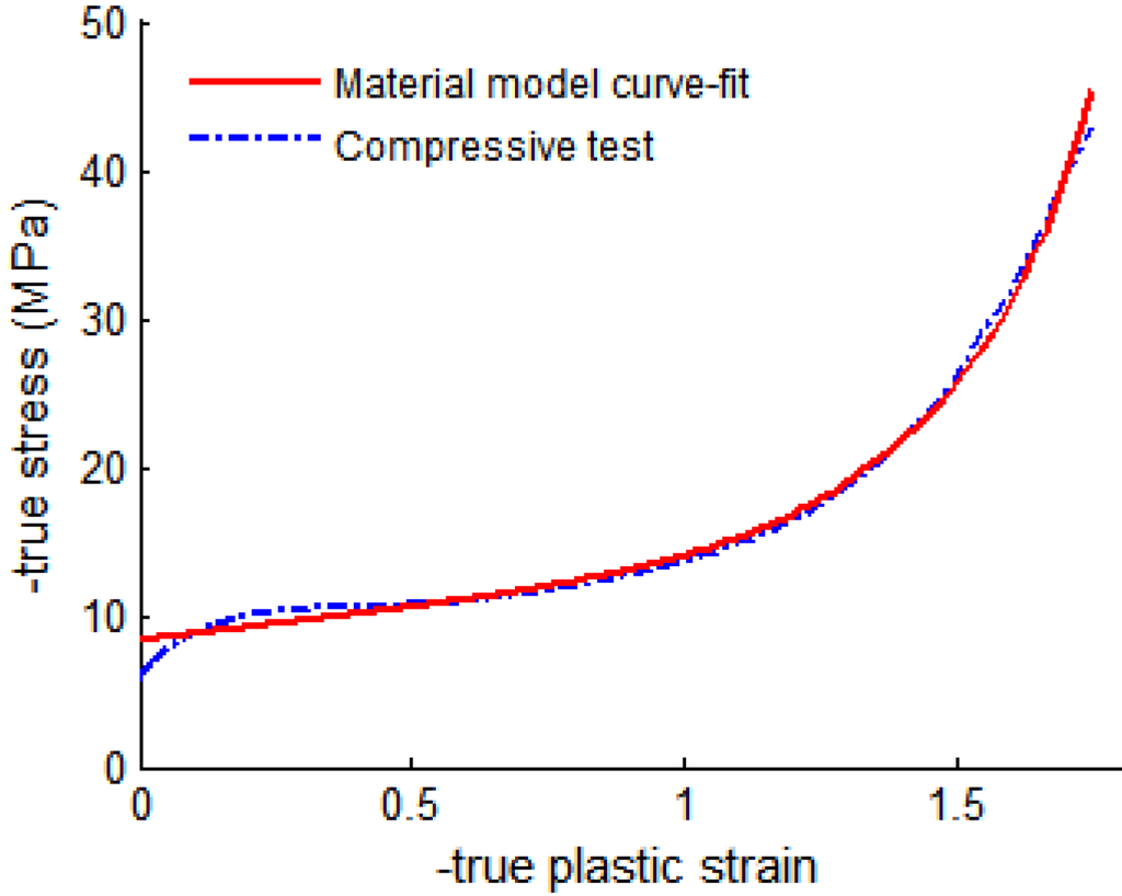 = D-F effective plastic strain [13]. Here, σp, γ, α2,βare material parameters, which are obtained by curve-fitting to experimental results (Figure 10). Calibrated input parameters for our foam are listed in Table 3.