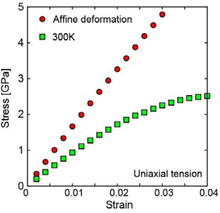 Stress-strain curve of glassy iron by simulation for uniaxial tension. Compared to the curve expected for affine deformation the apparent shear modulus is significantly lower.