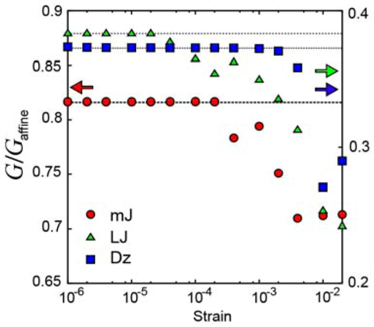 It should be noted that in metals the interatomic potentials are dominated by the Friedel oscillation [27], and tend to have a maximum between the first and the second peaks of the PDF. Thus the mJ and Dz potentials are better suited for modeling metallic glasses. Also both LJ and Dz glasses show very strong softening, by more than 60% compared to the affine (Born) value, whereas experimentally the extent of softening is only 30%. Thus the mJ potential is the most realistic among the three even on this account alone.