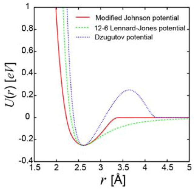 The Lennard-Jones potential compared with the Modified Johnson potential for iron and the Dzugutov potential.