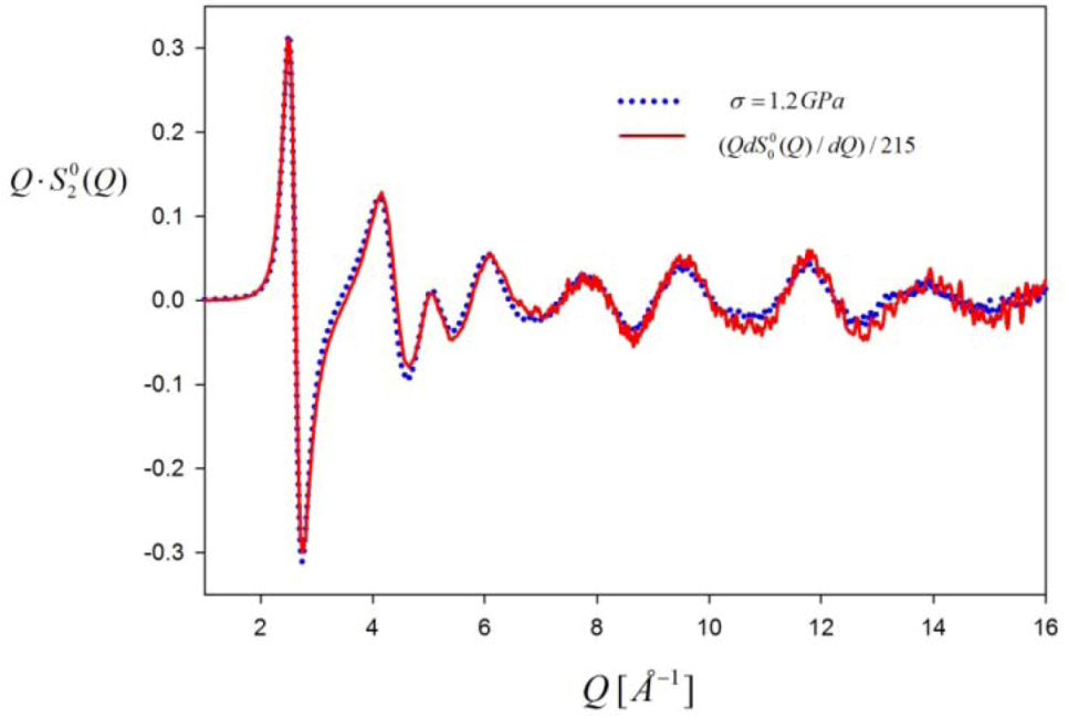 Reference [39] goes further to argue that S(Q) is influenced by deformation only up to qc = 6 Å−1, and thus the core of the clusters are not deformed. The basis of their argument is their observation that the strain-induced anisotropy in S(Q), ∆S(Q), is zero beyond qc. But this observation differs from other studies, and is simply incorrect; the problem is poor statistics in the measurement. As we discussed above ∆S(Q) is nearly proportional to dS(Q)/dQ [21,42]. If we actually compare Q∆S(Q) with QdS(Q)/dQ (Figure 6) they are nearly proportional to each other, and the cut-off of 6 Å−1 does not exist, in clear disagreement with the assertion in [39].