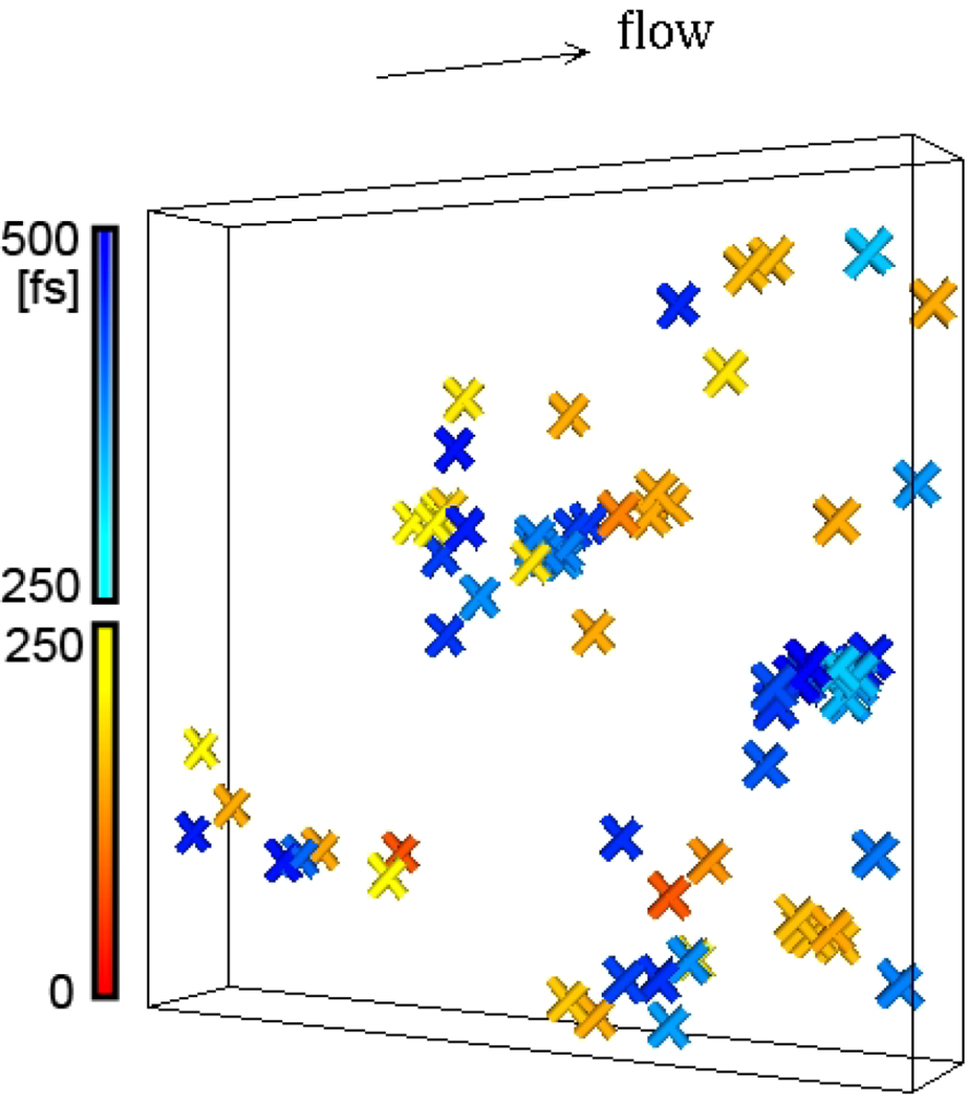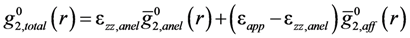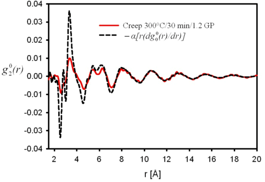 is the anisotropic PDF for anelastic deformation shown below in Figure 7. The fraction of the affine strain to the total strain, z = εzz,aff/εapp, was found to be about 0.76, implying as much as 24% of the strain originates from the anelastic effect. As it turns out this fraction is exactly what has been assumed in the theory of glass transition [43] to be the fraction of the liquid-like atomic sites at the glass transition.