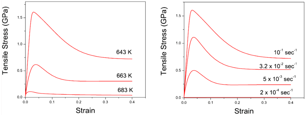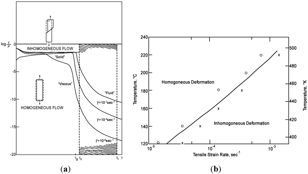 At room temperature metallic glasses fail by forming shear bands, where plastic strains are strongly localized. Failure behavior is controlled by nucleation of shear bands and interaction among multiple shear bands [2,3,7,47,48,49]. At higher temperatures, however, metallic glasses deform homogeneously through creep and fails after macroscopic necking. Such a behavior is common to all materials, as discussed by Ashby for crystalline materials [50] and by Spaepen for metallic glasses (Figure 10a [7] and shown by experimental data in Figure 10b [51]). The key quantity in an attempt to understand the behavior is the constitutive law for steady state flow;